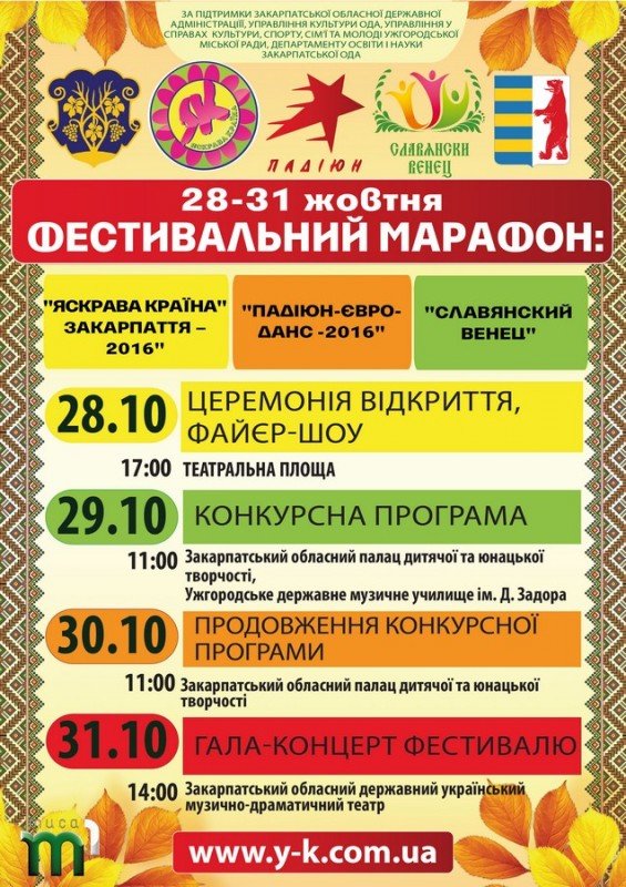 – Участь у цьогорічному дійстві візьме майже 1000 дітей з 14 областей. Більшість із учасників завітають до Ужгорода вперше, тож, окрім творчих змагань, на гостей чекає також знайомство з мальовничим європейським містом, яке справедливо називають однією з культурних столиць України. В рамках марафону одночасно відбудуться одразу чотири конкурси: ІIІ Всеукраїнський відкритий фестиваль-конкурс сучасної дитячо-юнацької творчості "Яскрава країна Закарпаття-2016", ІІI Всеукраїнський відкритий дитячо-юнацький фестиваль-конкурс національних культур та народної творчості "Яскрава країна Закарпаття-2016", Міжнародний фестиваль-конкурс дитячої та юнацької хореографії "ПАДІЮН-ЄВРОДАНС-2016" і Міжнародний фестиваль-конкурс "Славянский Венец", який зазвичай проходить на теренах Болгарії. Оцінюватиме виступи малих та юних музикантів, співаків і танцівників міжнародне журі у складі відомих діячів культури і мистецтв України, Словаччини, Болгарії, Молдови та Білорусі, –кажуть організатори.