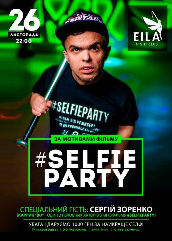 Цієї суботи - тематична вечірка за мотивами фільму #SelfieParty. Спецiальний гiсть - головний актор (карлик "Bu") - Сергій Зоренко