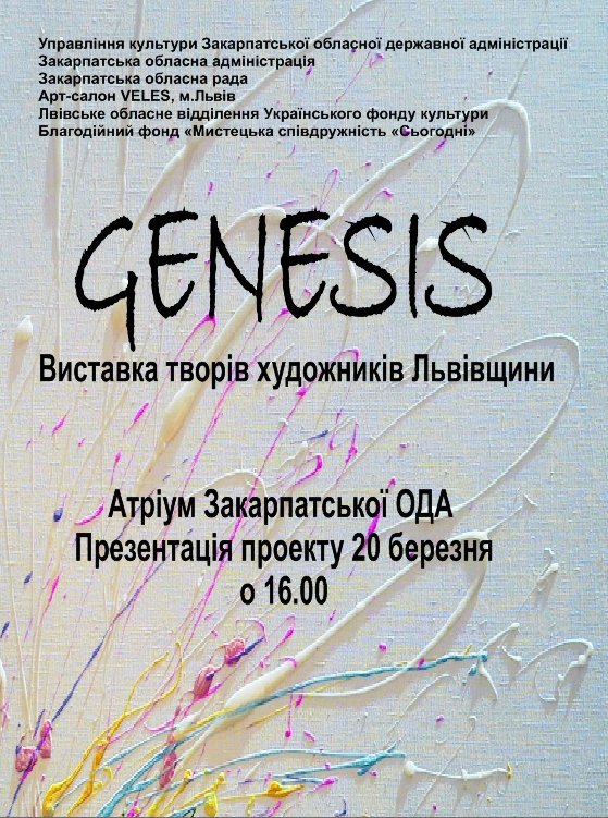 Масштабний проект, що розрахований на два роки, стартує вже 20 березня з виставки "Genesis", участь у якій візьмуть львівські майстри пензля: В.Богуславський, Л.Богуславська, Б.Буряк, С.Гай, С.Савченко, Р.Яців, М.Демцю, О.Звір, М.Ступінський, І.Проців, О.Проців, А.Атоян, О.Резніченко, І.Турецький, П.Сипняк, П.Сметана, О.Денисенко, І.Остафійчук, А.Береза, С.Міхновський, Р.Опалинський, О.Крохмалюк.