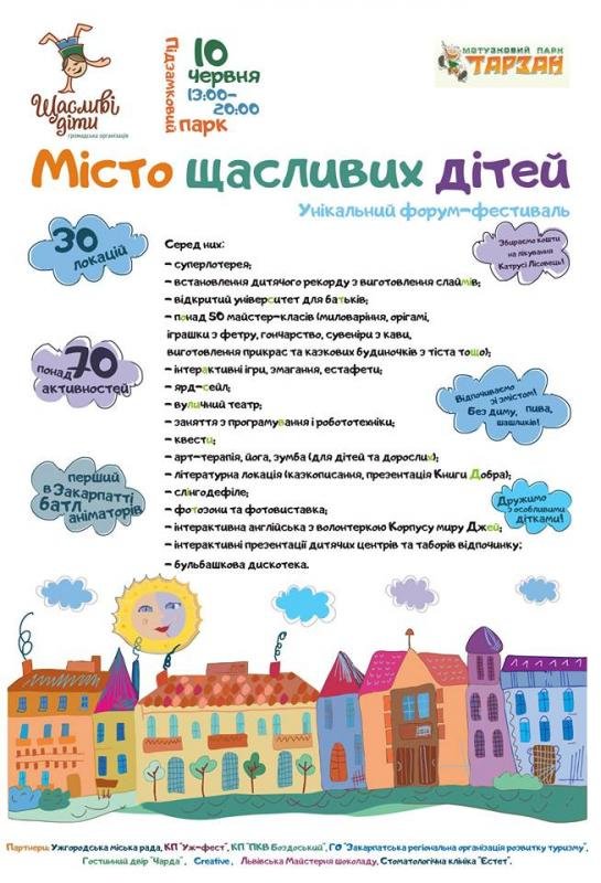 10 червня, у парку Підзамковий відбудеться унікальна для Ужгорода подія – форум-фестиваль «Місто щасливих дітей». Чому унікальна? Тому що такого заходу в нашому місті, як, власне, і у Закарпатті ще не було. Для чого цей форум-фестиваль? Для того, щоб привернути увагу дорослих до потреб дітей (а зазвичай це час і трохи уваги), укріпити сімейні зв’язки, продемонструвати широкі можливості для якісного відпочинку та розвитку дітей. А ще – щоб показати: фестивалі для дітей можуть бути без диму, пива, шашликів, проте з цікавим творчо-розважальним та смисловим наповненням, – кажуть організатори.