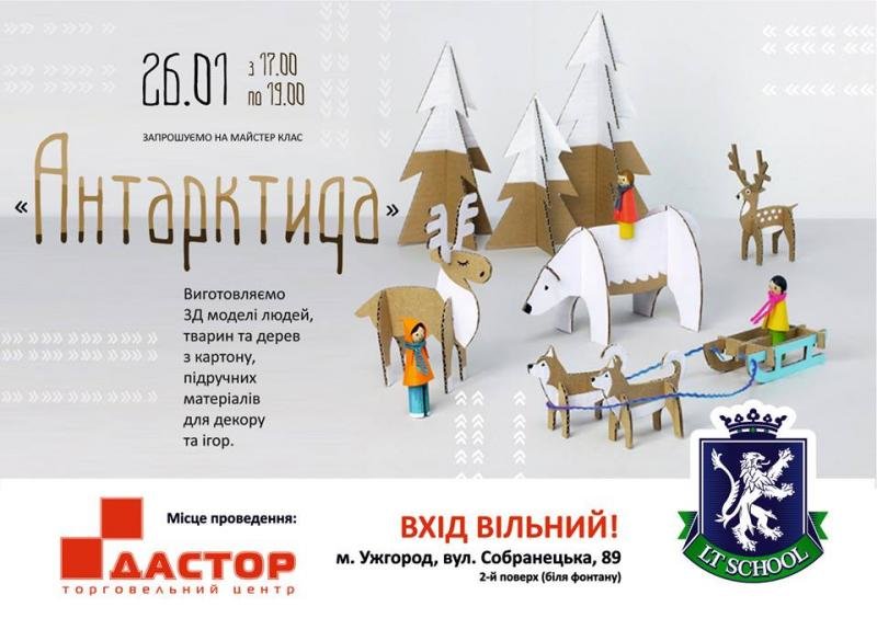 Приходьте на майстер клас "Антарктида". Ваші дітки навчаться виготовляти 3D моделі людей, тварин та дерев з картону, підручних матеріалів для декору.