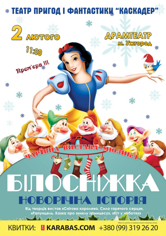 Театр «Каскадер» пропонує вам ще раз зануритись у прекрасну середньовічну історію про добро і зло, істинну красу і огидну заздрість, відданість і зраду. Отже, незабаром Білосніжці виповнюється 16 років, і вона має стати королевою. Але в її лютої мачухи геть інші плани - вона хоче захоплювати все нові і нові землі та вічно лишатися молодою і прекрасною. Проте на заваді стоїть юна і вразлива Білосніжка. Тож, мачуха виганяє її до темного лісу, де на принцесу чекає зустріч із гномами…. Про пригоди Білосніжки, боротьбу за своє щастя, справжню дружбу і кохання повідають герої нашої веселої казки.