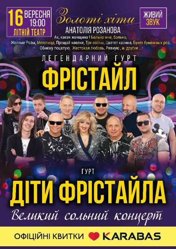 Дети Фристайла и Фристайл в Вашем городе! Продюсерский центр Анатолия Розанова совместно с Национальным гастрольным концертным сервисом SILUET представляет: Сольный грандиозный концерт группы “Дети Фристайла” и легендарной группы “Фристайл” в Вашем городе.В совместной программе будут звучать известные популярные песни и новые хиты. «Дети Фристайла» — это новый проект продюсера Анатолия Розанова. Именно он является главным вдохновителем и автором всех песен группы «Фристайл», песни которой звучали из каждого окна, а на концертах яблоку негде было упасть. В этот вечер Вас ждёт масса положительных эмоций и прекрасное настроение, которое подарят Вам два музыкальных проекта на одной сцене.