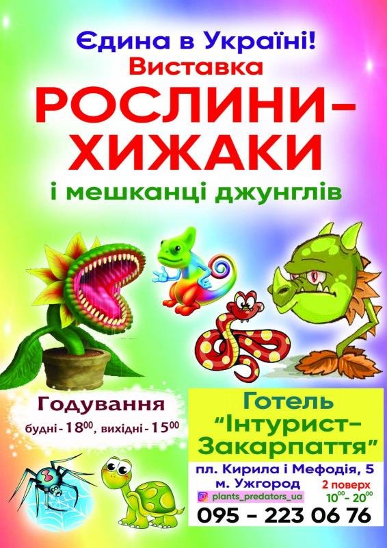 Відправляйтесь у незабутню подорож до світу живої природи та розгадайте її загадки на виставці «Рослини-хижаки та мешканці джунглів», яка проходить у готелі "ІНТУРИСТ-Закарпаття" (пл. Кирила і Мефодія, 5, поверх 2).