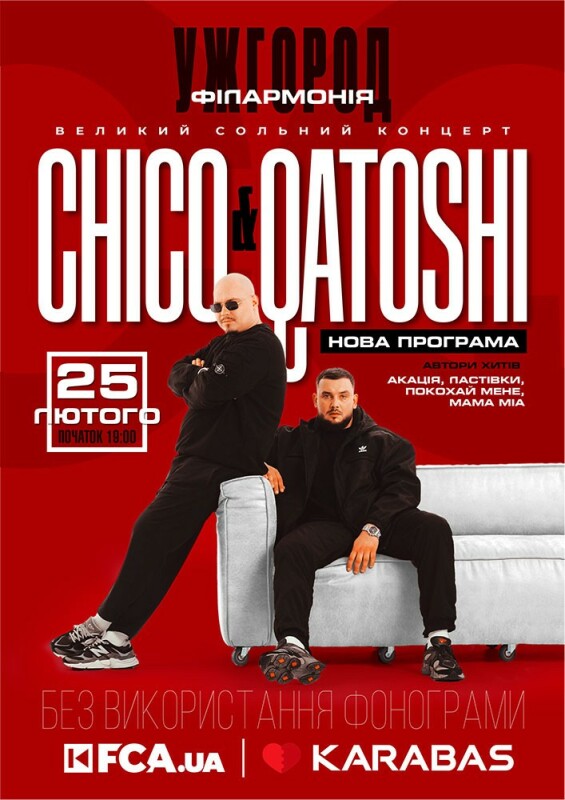 Вже зовсім скоро Chico & Qatoshi дають свій сольний концерт у вашом місті , де разом з вами заспівають улюблені хіти та нові пісні.