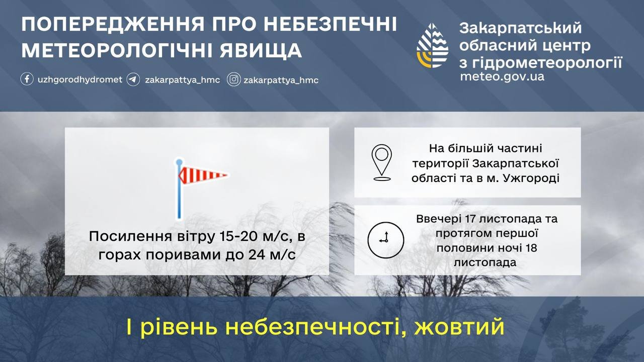За інформацією Закарпатського гідрометцентру, ввечері 17 листопада та протягом першої половини ночі 18 листопада на більшій частині території Закарпатської області та в Ужгороді очікується посилення північного вітру до 15-20 м/с, в горах пориви до 24 м/с.