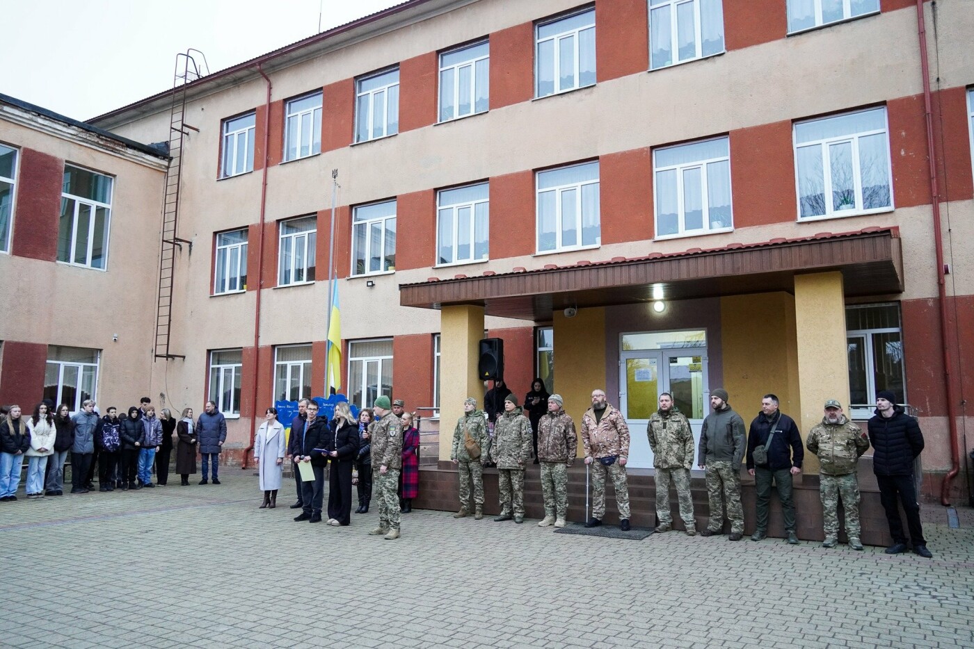 Символічним жестом стало підняття стяга сином військовослужбовця, учнем 11-Б класу Володимиром Обрезковим та ветераном російсько-української війни Михайлом Шум’яцьким.