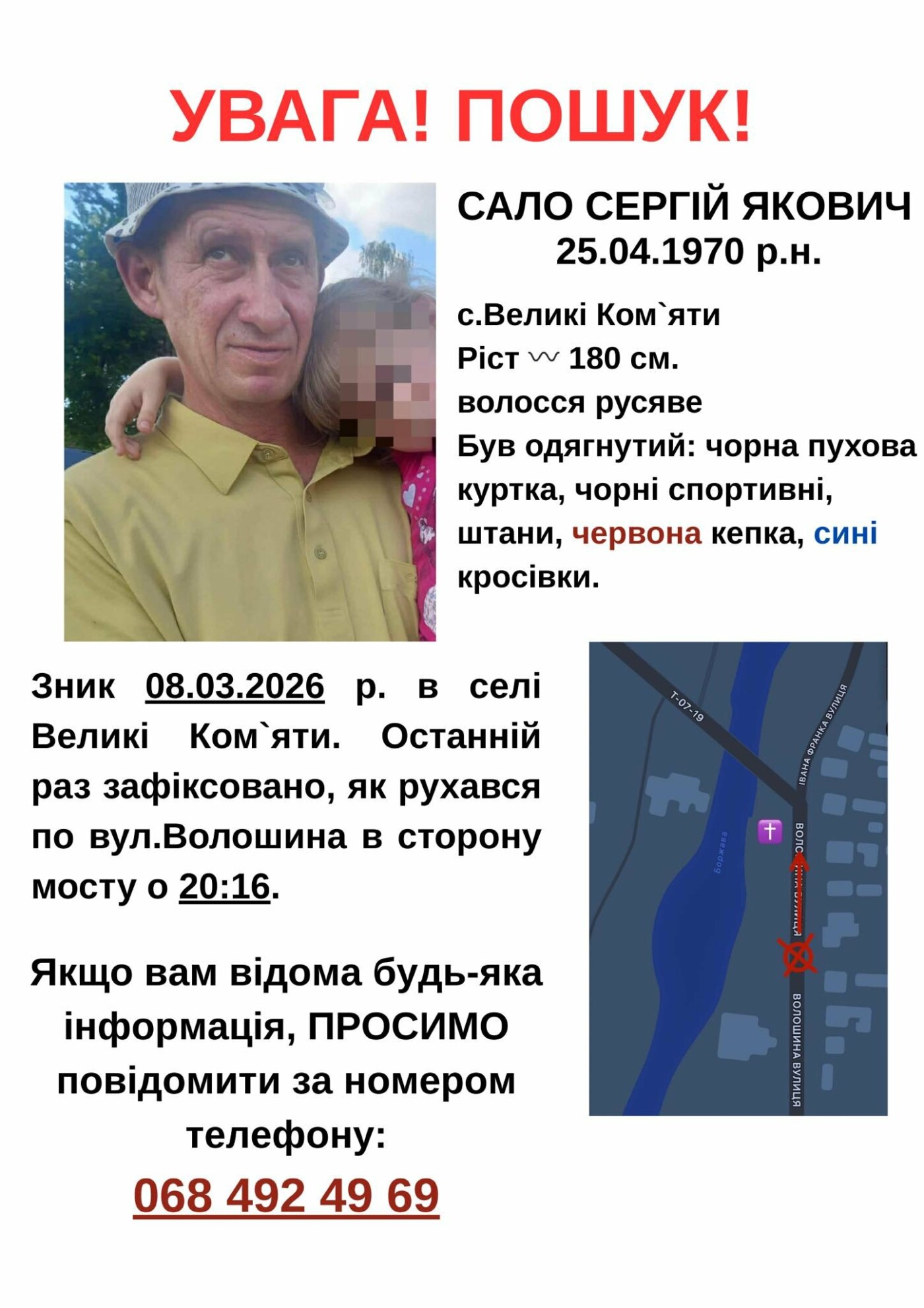 55-річний Сергій Сало зник 8 березня в селі Великі Комʼяти. Рідні повідомили у мережі, що востаннє камери відеоспостереження та свідки зафіксували його о 20:16 по вулиці Волошина у напрямку мосту в селі.